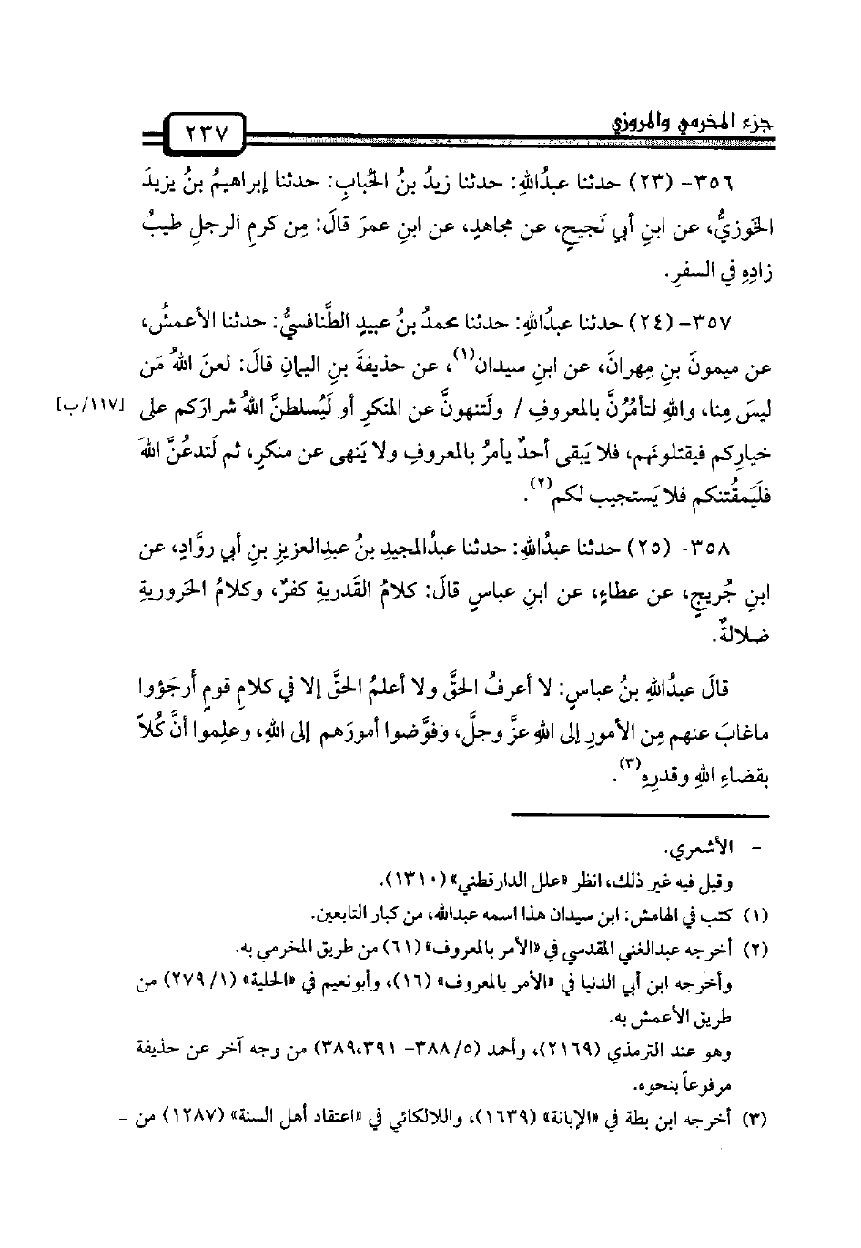 358 - (25) حدثنا عبدُاللهِ: حدثنا عبدُالمجيدِ بنُ عبدِالعزيزِ بنِ أبي روَّادٍ، عن ابنِ جُريجٍ، عن عطاءٍ، عن ابنِ عباسٍ قالَ: كلامُ القَدريةِ كفرٌ، وكلامُ الحَروريةِ ضلالةٌ.