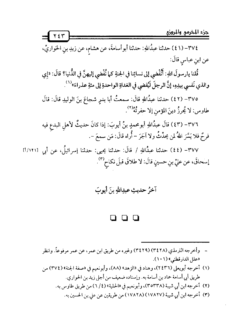 376 - (43) قالَ عبدُاللهِ أبومحمدٍ بنُ أيوبَ: إذا كانَ حديثٌ لأهلِ البدعِ فيه فرحٌ فلا يَسَّرَ اللهُ لمن يحدِّثُ ولا آجَرَ - أُراه قالَ: مَن سمعَ -.