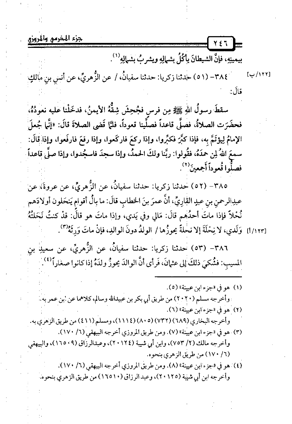 384 - (51) حدثنا زكريا: حدثنا سفيانُ، / عن الزُّهريِّ، عن أنسِ بنِ مالكٍ قالَ: