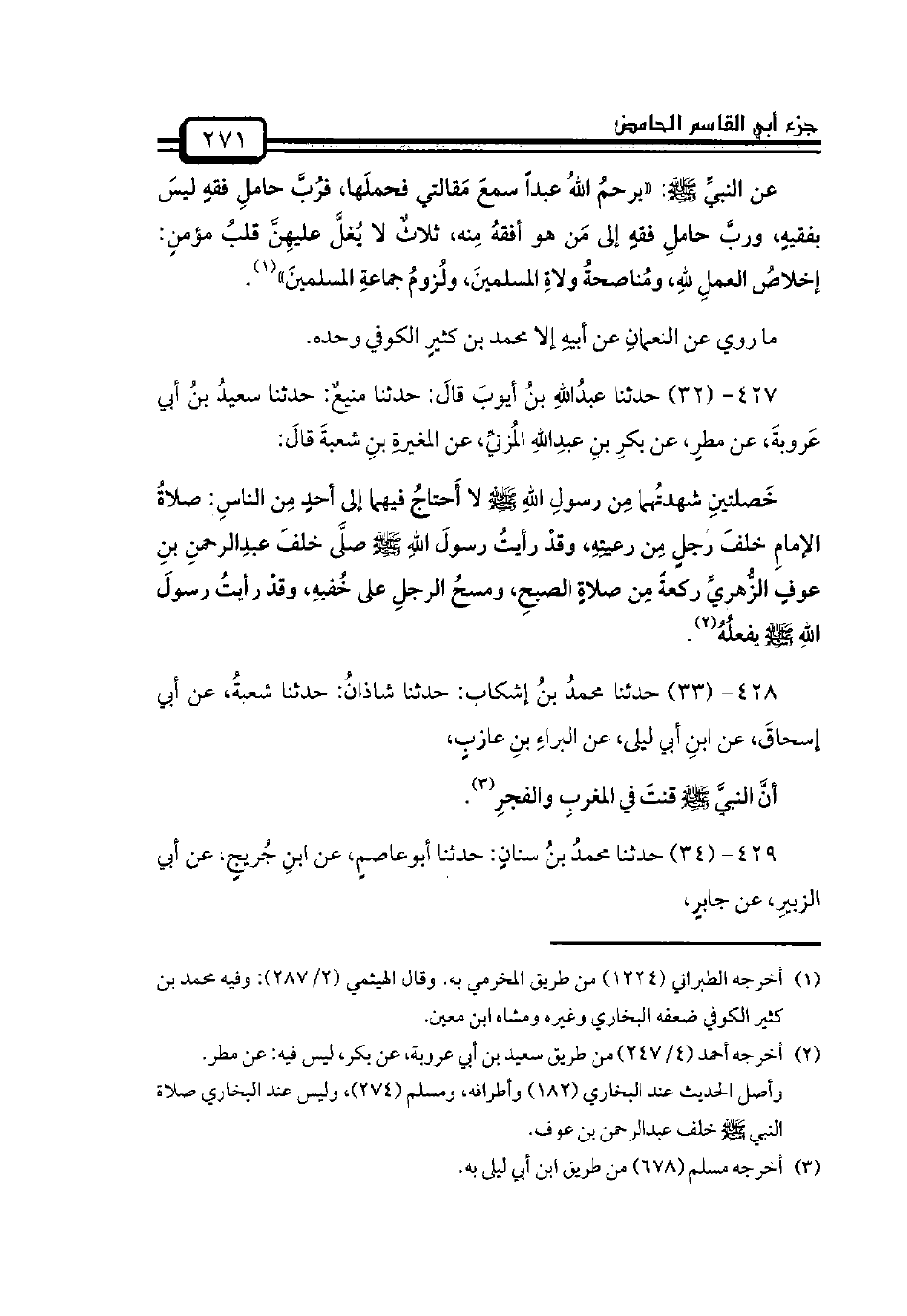 430 - (35) حدثنا حفصُ بنُ عمرو الرَّبالي: حدثنا عبدُالرحمنِ بنُ مَهدي: حدثنا سفيانُ، عن الأعمشِ، عن المسيبِ بنِ رافعٍ، عن تميمِ بنِ طَرَفةَ، عن جابرِ بنِ سمرةَ قالَ: