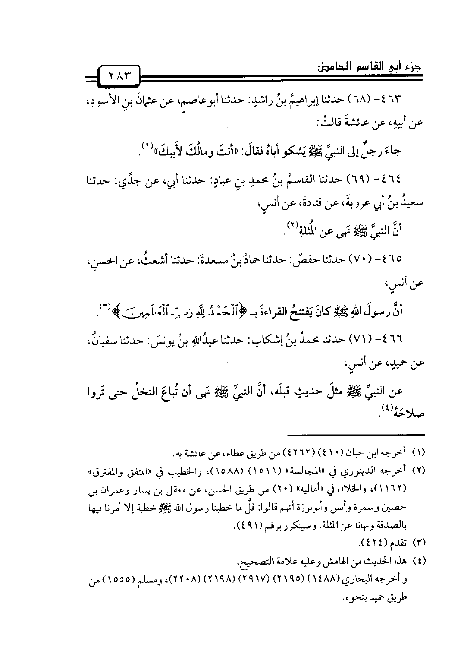 468 - (73) حدثنا الحسنُ بنُ عرفةَ: حدثنا عبادُ بنُ عبادٍ المُهلبيُّ، عن هشامِ بنِ زيادٍ، عن عمارِ بنِ سعدٍ، عن عثمانَ بنِ أرقمَ بنِ أبي الأرقمِ المَخزوميِّ، عن أبيهِ - وكانتْ لَه صحبةٌ - / قالَ: