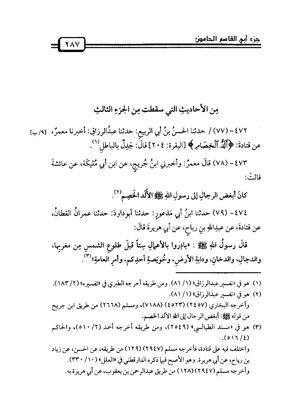 475 - (80) حدثنا أبورفاعةَ العَدويُّ: حدثنا عبدُالرحيمِ بنُ سَليمِ بنِ حيانَ: حدثنا أَبي، عن نافعٍ، عن ابنِ عمرَ، عن الزبيرِ بنِ العوامِ،