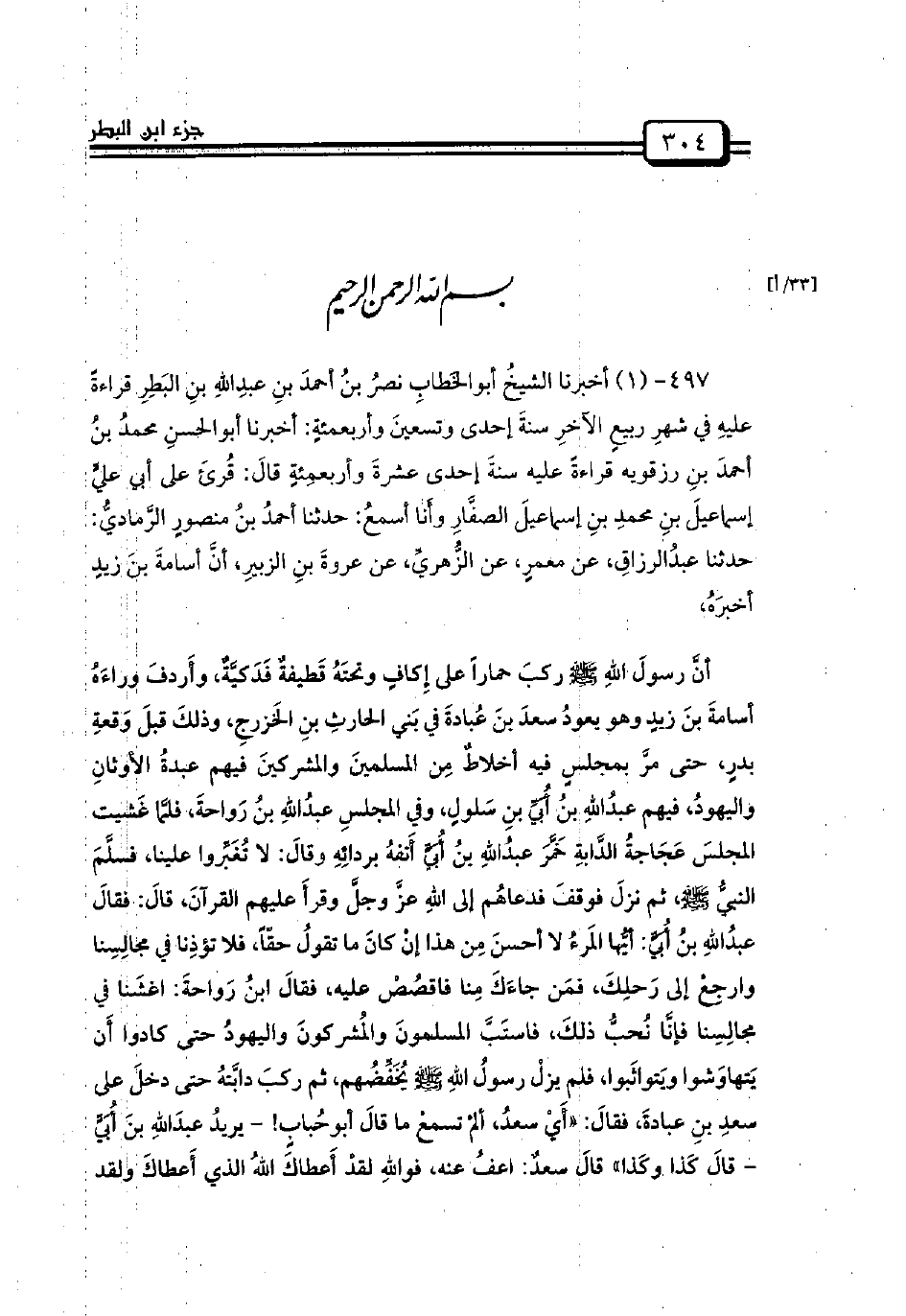 497 - (1) أخبرنا الشيخُ أبوالخَطابِ نصرُ بنُ أحمدَ بنِ عبدِاللهِ بنِ البَطِرِ قراءةً عليهِ في شهرِ ربيعٍ الآخرِ سنةَ إحدى وتسعينَ وأربعمئةٍ: أخبرنا أبوالحسنِ محمدُ بنُ أحمدَ بنِ رزقويه قراءةً عليه سنةَ إحدى عشرةَ وأربعمِئةٍ قالَ: قُرئَ على أبي عليٍّ إسماعيلَ بنِ محمدِ بنِ إسماعيلَ الصفَّارِ وأَنا أسمعُ: حدثنا أحمدُ بنُ منصورٍ الرَّماديُّ: حدثنا عبدُالرزاقِ، عن معمرٍ، عن الزُّهريِّ، عن عروةَ بنِ الزبيرِ، أنَّ أسامةَ بنَ زيدٍ أخبرَهُ،