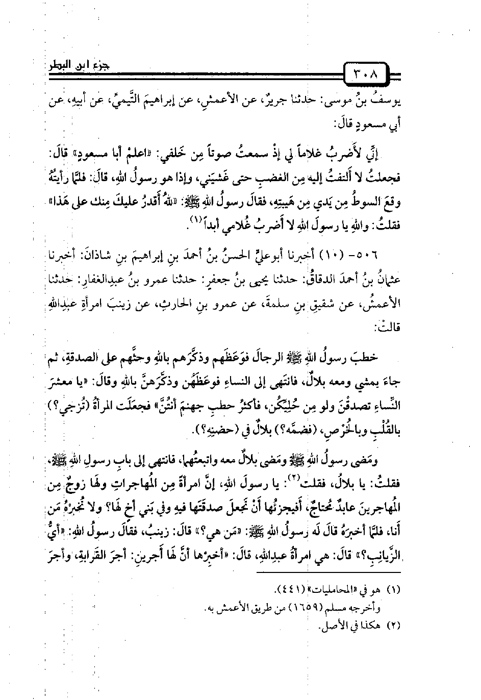 506 - (10) أخبرنا أبوعليٍّ الحسنُ بنُ أحمدَ بنِ إبراهيمَ بنِ شاذانَ: أخبرنا عثمانُ بنُ أحمدَ الدقاقُ: حدثنا يحيى بنُ جعفرٍ: حدثنا عمرو بنُ عبدِالغفارِ: حدثنا الأعمشُ، عن شقيقِ بنِ سلمةَ، عن عمرو بنِ الحارثِ، عن زينبَ امرأةِ عبدِاللهِ قالتْ: