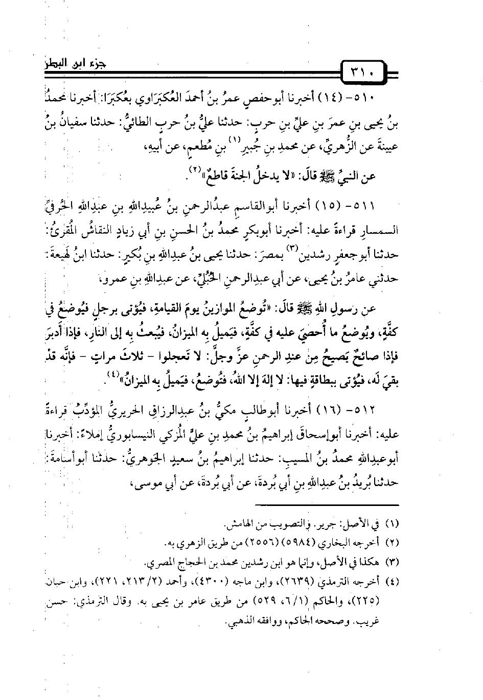 512 - (16) أخبرنا أبوطالبٍ مكيُّ بنُ عبدِالرزاقِ الحريريُّ المؤدِّبُ قراءةً عليه: أخبرنا أبوإسحاقَ إبراهيمُ بنُ محمدِ بنِ عليٍّ المُزكي النيسابوريُّ إملاءً: أخبرنا أبوعبدِاللهِ محمدُ بنُ المسيبِ: حدثنا إبراهيمُ بنُ سعيدٍ الجَوهريُّ: حدثنا أبوأسامةَ: حدثنا بُريدُ بنُ عبدِاللهِ بنِ أبي بُردةَ، عن أبي بُردةَ، عن أبي موسى،