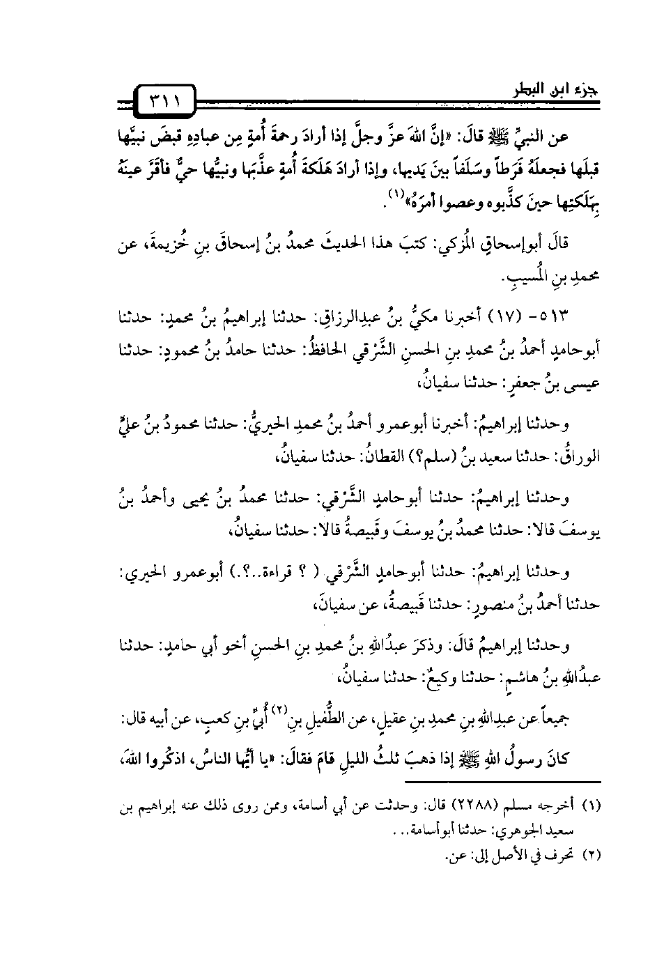 وحدثنا إبراهيمُ: أخبرنا أبوعمرو أحمدُ بنُ محمدِ الحيريُّ: حدثنا محمودُ بنُ عليٍّ الوراقُ: حدثنا سعيد بنُ (سلم؟) القطانُ: حدثنا سفيانُ،