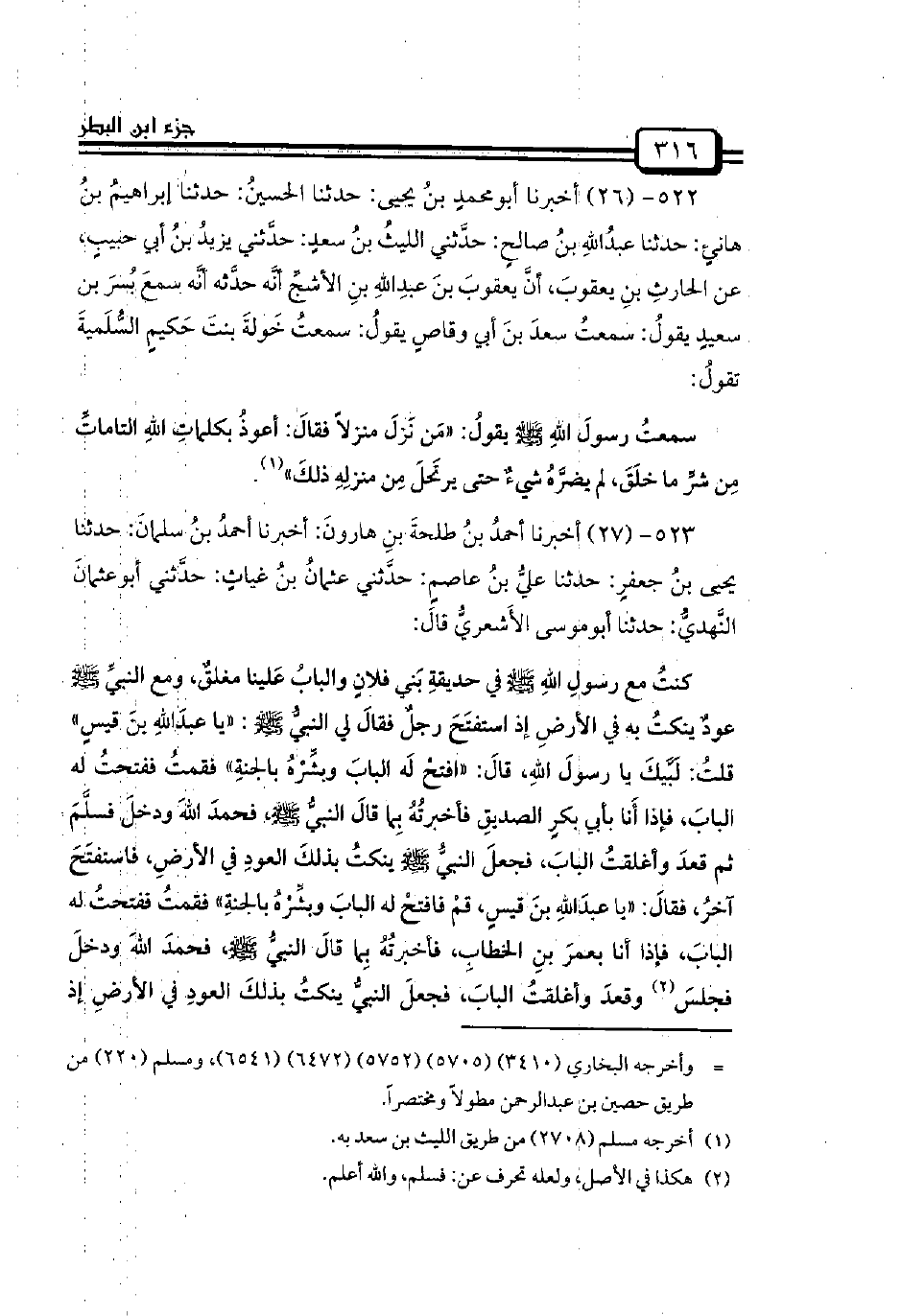 523 - (27) أخبرنا أحمدُ بنُ طلحةَ بنِ هارونَ: أخبرنا أحمدُ بنُ سلمانَ: حدثنا يحيى بنُ جعفرٍ: حدثنا عليُّ بنُ عاصمٍ: حدَّثني عثمانُ بنُ غياثٍ: حدَّثني أبوعثمانَ النَّهديُّ: حدثنا أبوموسى الأَشعريُّ قالَ: