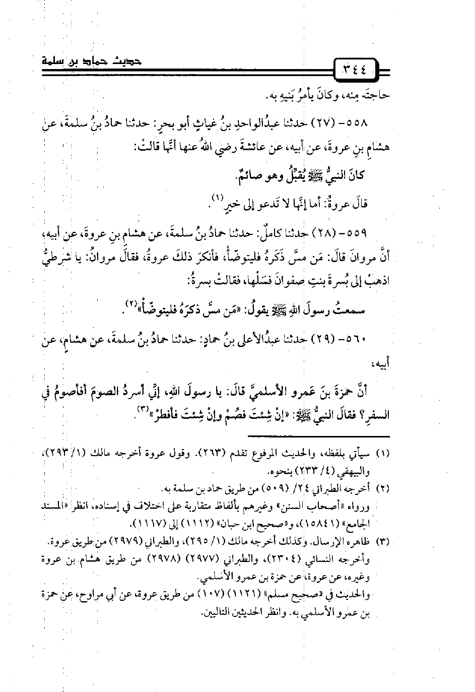 559 - (28) حدثنا كاملٌ: حدثنا حمادُ بنُ سلمةَ، عن هشامِ بنِ عروةَ، عن أبيه، أنَّ مروانَ قالَ: مَن مسَّ ذَكَرهُ فليتوضّأْ، فأنكرَ ذلكَ عروةُ، فقالَ مروانُ: يا شرطيُّ اذهبْ إلى بُسرةَ بنتِ صفوانَ فسَلْها، فقالتْ بسرةُ: