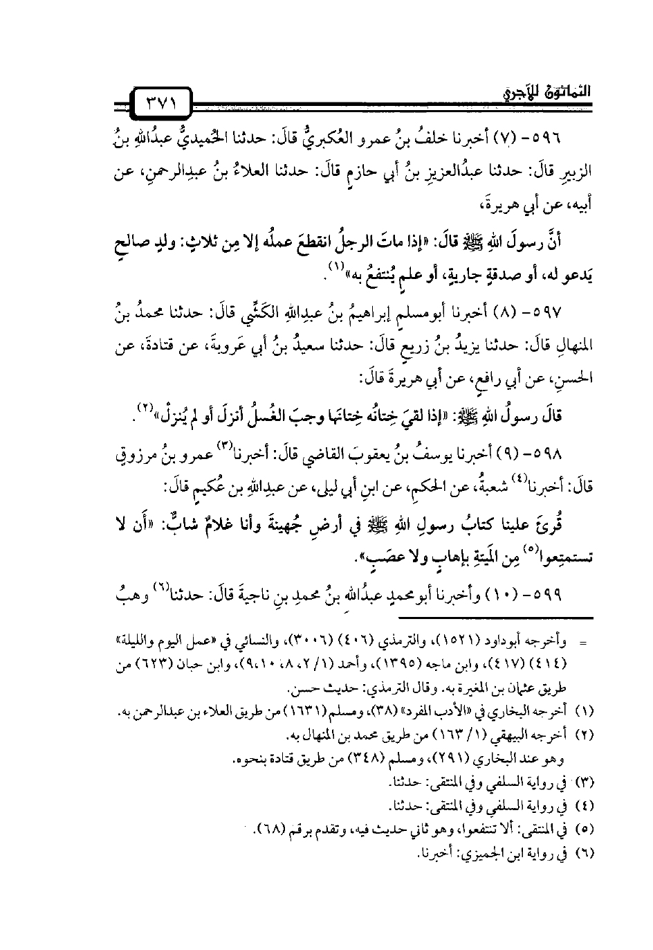 596 - (7) أخبرنا خلفُ بنُ عمرو العُكبريُّ قالَ: حدثنا الحُميديُّ عبدُاللهِ بنُ الزبيرِ قالَ: حدثنا عبدُالعزيزِ بنُ أبي حازمٍ قالَ: حدثنا العلاءُ بنُ عبدِالرحمنِ، عن أبيه، عن أبي هريرةَ،