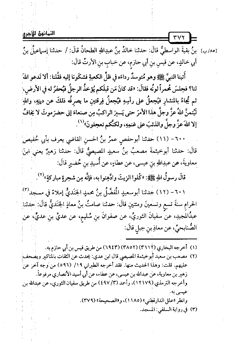 601 - (12) حدثنا أبوسعيدٍ المُفضَّلُ بنُ محمدٍ الجَنَديُّ إملاءً في مسجد الحرامِ سنةَ تسعٍ وتسعينَ ومئتينِ قالَ: حدثنا صامتُ بنُ معاذٍ الجَنَديُّ قالَ: حدثنا عبدُالمجيدِ، عن سفيانَ الثوريِّ، عن صفوانَ بنِ سُليمٍ، عن عديِّ بنِ عديٍّ، عن الصُّنابحيِّ، عن معاذِ بنِ جبلٍ قالَ: