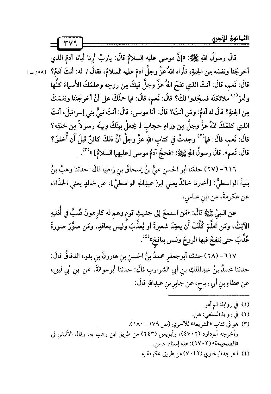 عن النبيِّ صلى الله عليه وسلم قالَ: «مَن استمعَ إلى حديثِ قومٍ وهم له كارِهونَ صُبَّ في أُذنيهِ الآنُكُ، ومَن تحلَّمَ كُلِّفَ أَن يعقِدَ شعيرةً أو يُعذَّبَ وليس بعاقدٍ، ومَن صوَّرَ صورةً عُذِّبَ حتى يَنفخَ فيها الروحَ وليس بنافخٍ».