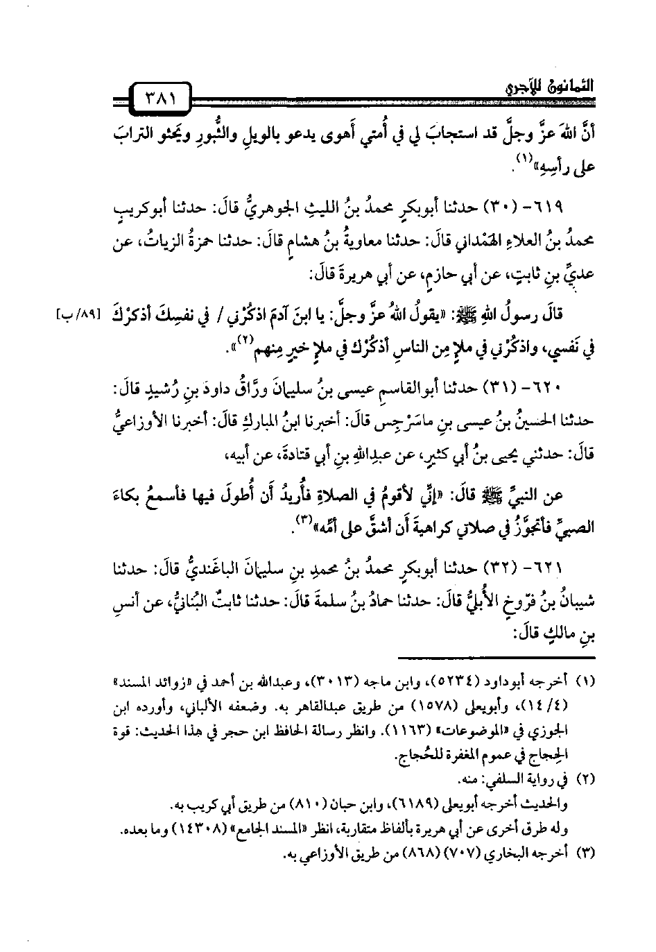 619 - (30) حدثنا أبوبكرٍ محمدُ بنُ الليثِ الجوهريُّ قالَ: حدثنا أبوكريبٍ محمدُ بنُ العلاءِ الهَمْداني قالَ: حدثنا معاويةُ بنُ هشامٍ قالَ: حدثنا حمزةُ الزياتُ، عن عديِّ بنِ ثابتٍ، عن أبي حازمٍ، عن أبي هريرةَ قالَ: