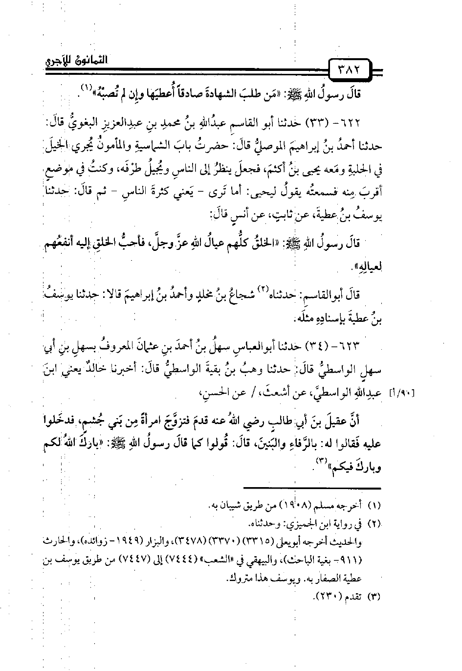 622 - (33) حدثنا أبو القاسمِ عبدُاللهِ بنُ محمدِ بنِ عبدِالعزيزِ البغويُّ قالَ: حدثنا أحمدُ بنُ إبراهيمَ الموصليُّ قالَ: حضرتُ بابَ الشماسيةِ والمأمونُ يُجري الخيلَ في الحلبةِ ومَعه يحيى بنُ أكثمَ، فجعلَ ينظرُ إلى الناسِ ويُجيلُ طرْفَه، وكنتُ في موضعٍ أقربَ مِنه فسمعتُه يقولُ ليحيى: أما تَرى - يَعني كثرةَ الناسِ - ثم قالَ: حدثنا يوسفُ بنُ عطيةَ، عن ثابتٍ، عن أنسٍ قالَ: