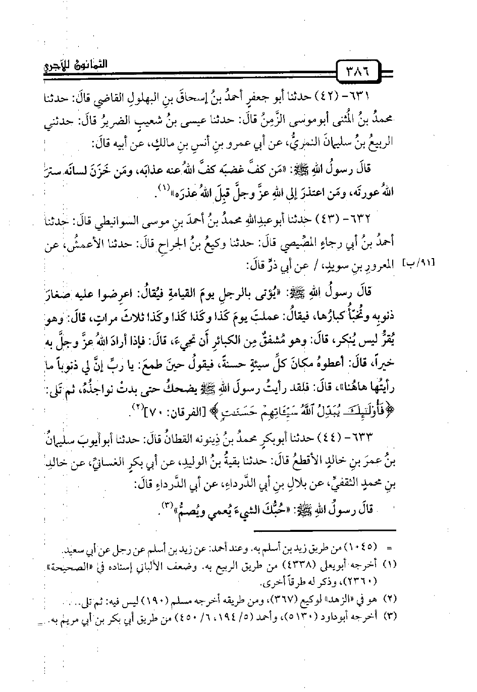 633 - (44) حدثنا أبوبكرٍ محمدُ بنُ ذِينونه القطانُ قالَ: حدثنا أبوأيوبَ سليمانُ بنُ عمرَ بنِ خالدٍ الأقطعُ قالَ: حدثنا بقيةُ بنُ الوليدِ، عن أبي بكرٍ الغسانيِّ، عن خالدِ بنِ محمدٍ الثقفيِّ، عن بلالِ بنِ أبي الدَّرداءِ، عن أبي الدَّرداءِ قالَ:
