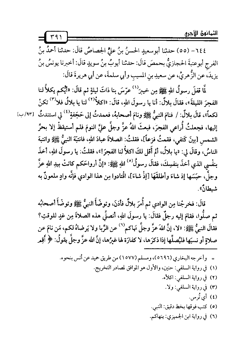 لمَّا قفلَ رسولُ اللهِ صلى الله عليه وسلم مِن خيبرَ عرّسَ بنا ذاتَ ليلةٍ ثم قالَ: «أيُّكم يكلأُ لنا الفجرَ الليلةَ»، فقالَ بلالٌ: أنا يا رسولَ اللهِ، قالَ: «اكلأْ لنا يا بلالُ فلا تكنْ لكعاً»، قالَ بلالٌ: / فنامَ النبيُّ صلى الله عليه وسلم ونامَ أصحابهُ، فعمدتُ إلى حَجَفةٍ لي استندتُ إليها، فجعلتُ أُراعي الفجرَ، فبعثَ اللهُ عزَّ وجلَّ عليَّ النومَ فلم أستيقظْ إلا بحرِّ الشمسِ [بينَ كَتفي، فقمتُ فزعاً]، فقلتُ: الصلاةَ عبادَ اللهِ، فانتبَهَ النبيُّ صلى الله عليه وسلم وانتبهَ الناسُ، وقالَ لي: «يا بلالُ، ألم أَقل لكَ اكلأْ لنا الفجرَ!»، فقلتُ: يا رسولَ اللهِ، أخذَ بنفْسي الذي أخذَ بنفسِكَ، فقالَ رسولُ اللهِ صلى الله عليه وسلم: «إنَّ أرواحَكم كانتْ بيدِ اللهِ عزَّ وجلَّ، حبَسَها إذ شاءَ وأطلقَهَا [إذْ شاءَ]، اقْتادوا مِن هذا الوادي فإنَّه وادٍ ملعونٌ به شيطانٌ».