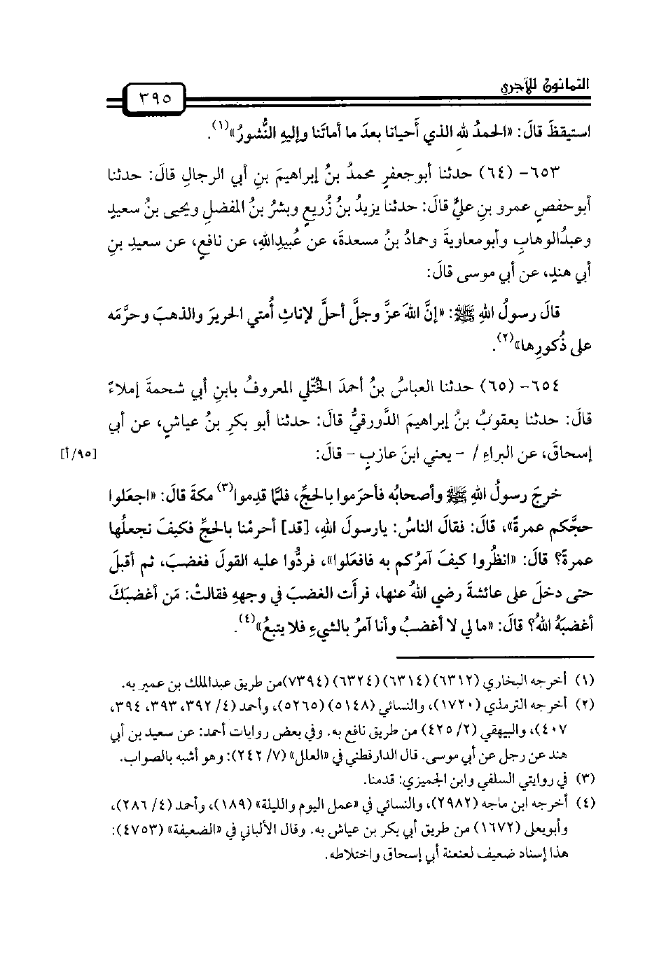 653 - (64) حدثنا أبوجعفرٍ محمدُ بنُ إبراهيمَ بنِ أبي الرجالِ قالَ: حدثنا أبوحفصٍ عمرو بنِ عليٍّ قالَ: حدثنا يزيدُ بنُ زُريعٍ وبشرُ بنُ المفضلِ ويحيى بنُ سعيدٍ وعبدُالوهابِ وأبومعاويةَ وحمادُ بنُ مسعدةَ، عن عُبيدِاللهِ، عن نافعٍ، عن سعيدِ بنِ أبي هندٍ، عن أبي موسى قالَ: