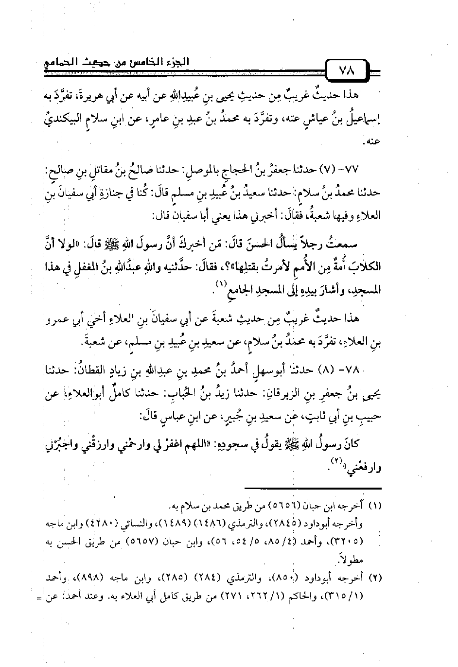 77 - (7) حدثنا جعفرُ بنُ الحجاجِ بالموصلِ: حدثنا صالحُ بنُ مقاتلِ بنِ صالحٍ: حدثنا محمدُ بنُ سلامٍ: حدثنا سعيدُ بنُ عُبيدِ بنِ مسلمٍ قالَ: كُنا في جنازةِ أبي سفيانَ بنِ العلاءِ وفيها شعبةُ، فقالَ: أخبرني هذا يعني أبا سفيان قال:
