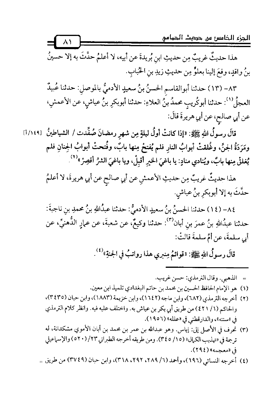 83 - (13) حدثنا أبوالقاسمِ الحسنُ بنُ سعيدٍ الأدميُّ بالموصلِ: حدثنا عُبيدٌ العجلُ: حدثنا أبوكُريبٍ محمدُ بنُ العلاءِ: حدثنا أبوبكرِ بنُ عياشٍ، عن الأعمشِ، عن أبي صالحٍ، عن أبي هريرةَ قالَ: