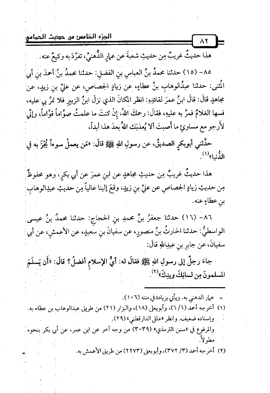 86 - (16) حدثنا جعفرُ بنُ محمدِ بنِ الحجاجِ: حدثنا محمدُ بنُ عيسى الواسطيُّ: حدثنا الحارثُ بنُ منصورٍ، عن سفيانَ بنِ سعيدٍ، عن الأعمشِ، عن أبي سفيانَ، عن جابرِ بنِ عبدِاللهِ قالَ: