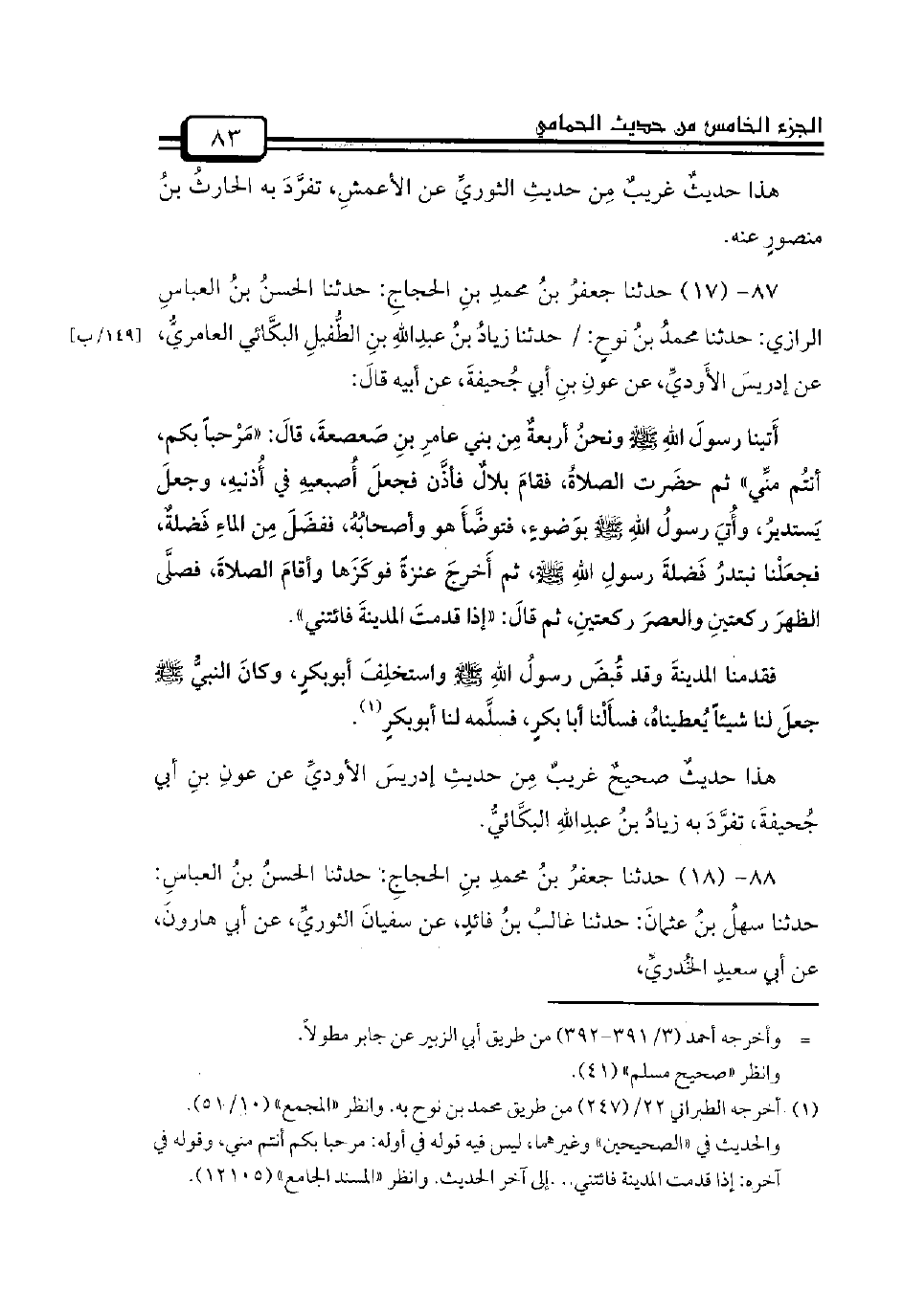 87 - (17) حدثنا جعفرُ بنُ محمدِ بنِ الحجاجِ: حدثنا الحسنُ بنُ العباسِ الرازي: حدثنا محمدُ بنُ نوحٍ: / حدثنا زيادُ بنُ عبدِاللهِ بنِ الطُّفيلِ البكَّائي العامريُّ، عن إدريسَ الأَوديِّ، عن عونِ بنِ أبي جُحيفةَ، عن أبيه قالَ: