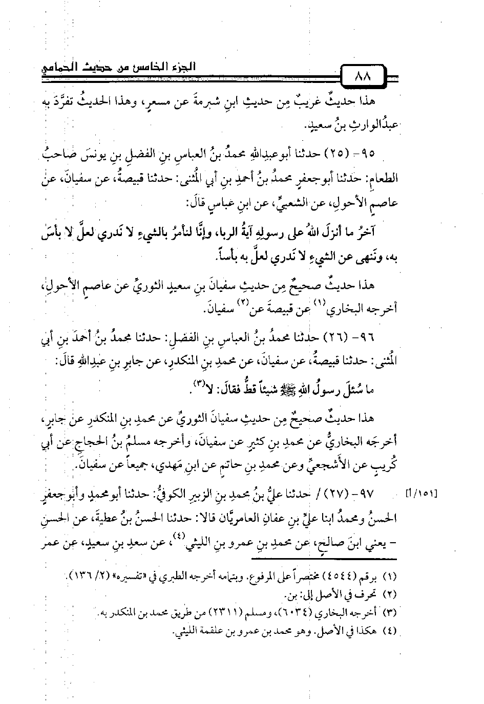 96 - (26) حدثنا محمدُ بنُ العباسِ بنِ الفضلِ: حدثنا محمدُ بنُ أحمدَ بنِ أبي المُثنى: حدثنا قبيصةُ، عن سفيانَ، عن محمدِ بنِ المنكدرِ، عن جابرِ بنِ عبدِاللهِ قالَ:
