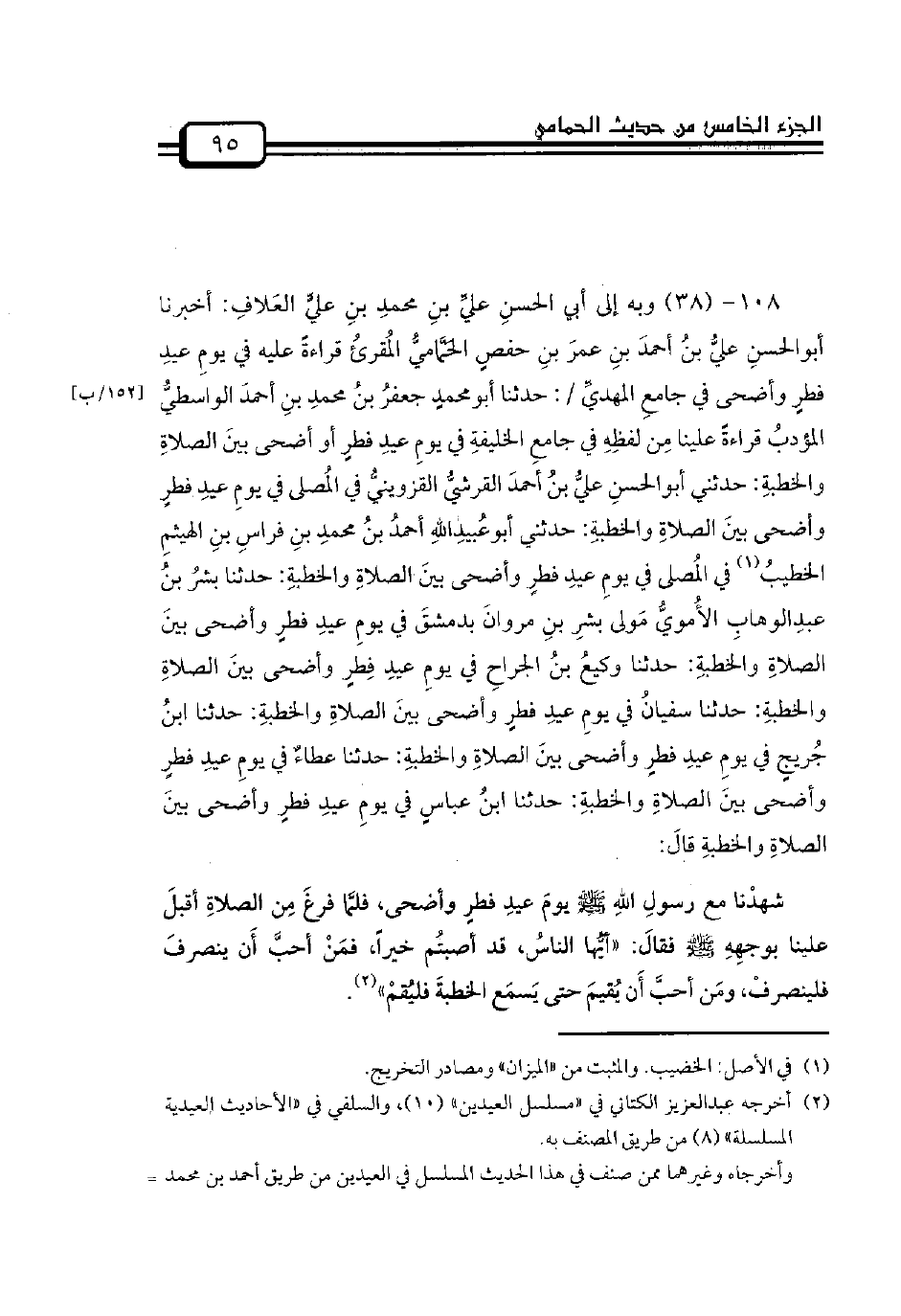 108 - (38) وبه إلى أبي الحسنِ عليِّ بنِ محمدِ بنِ عليٍّ العَلافِ: أخبرنا أبوالحسنِ عليُّ بنُ أحمدَ بنِ عمرَ بنِ حفصٍ الحَمَّاميُّ المُقرئُ قراءةً عليه في يومِ عيدِ فطرٍ وأضحى في جامعِ المهديِّ /: حدثنا أبومحمدٍ جعفرُ بنُ محمدِ بنِ أحمدَ الواسطيُّ المؤدبُ قراءةً علينا مِن لفظِهِ في جامعِ الخليفةِ في يومِ عيدِ فطرٍ أو أضحى بينَ الصلاةِ والخطبةِ: حدثني أبوالحسنِ عليُّ بنُ أحمدَ القرشيُّ القزوينيُّ في المُصلى في يومِ عيدِ فطرٍ وأضحى بينَ الصلاةِ والخطبةِ: حدثني أبوعُبيدِاللهِ أحمدُ بنُ محمدِ بنِ فراسِ بنِ الهيثمِ الخطيبُ في المُصلى في يومِ عيدِ فطرٍ وأضحى بينَ الصلاةِ والخطبةِ: حدثنا بشرُ بنُ عبدِالوهابِ الأُمويُّ مَولى بشرِ بنِ مروانَ بدمشقَ في يومِ عيدِ فطرٍ وأضحى بينَ الصلاةِ والخطبةِ: حدثنا وكيعُ بنُ الجراحِ في يومِ عيدِ فِطرٍ وأضحى بينَ الصلاةِ والخطبةِ: حدثنا سفيانُ في يومِ عيدِ فطرٍ وأضحى بينَ الصلاةِ والخطبةِ: حدثنا ابنُ جُريجٍ في يومِ عيدِ فطرٍ وأضحى بينَ الصلاةِ والخطبةِ: حدثنا عطاءٌ في يومِ عيدِ فطرٍ وأضحى بينَ الصلاةِ والخطبةِ: حدثنا ابنُ عباسٍ في يومِ عيدِ فطرٍ وأضحى بينَ الصلاةِ والخطبةِ قالَ: