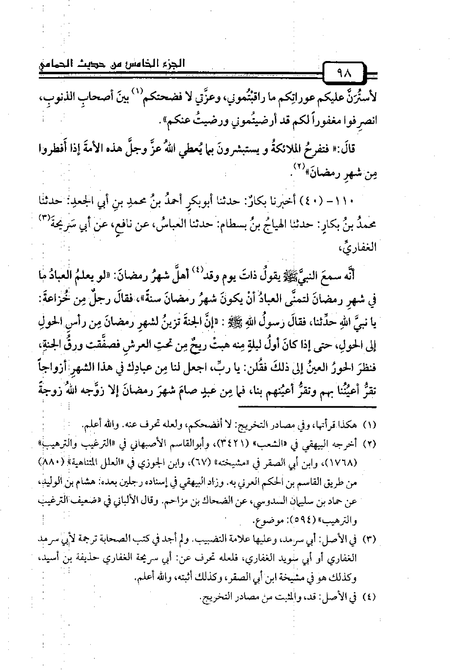 أنَّه سمعَ النبي صلى الله عليه وسلم يقولُ ذاتَ يوم وقد أهلَّ شهرُ رمضانَ: «لو يعلمُ العبادُ ما في شهرِ رمضانَ لتمنَّى العبادُ أنْ يكونَ شهرُ رمضانَ سنةً»، فقالَ رجلٌ مِن خُزاعةَ: يا نبيَّ اللهِ حدِّثنا، فقالَ رسولُ اللهِ صلى الله عليه وسلم: «إنَّ الجنةَ تزينُ لشهرِ رمضانَ مِن رأسِ الحولِ إلى الحولِ، حتى إذا كانَ أولُ ليلةٍ مِنه هبتْ ريحٌ مِن تحتِ العرشِ فصفَّقت ورقُ الجنةِ، فنظرَ الحورُ العينُ إلى ذلكَ فقُلن: يا ربِّ، اجعل لنا مِن عبادِك في هذا الشهرِ أزواجاً تقرُّ أعيُنُنا بهم وتقرُّ أعيُنهم بنا، فما مِن عبدٍ صامَ شهرَ رمضانَ إلا زوَّجه اللهُ زوجةً -[99]- مِن الحورِ العينِ في خيمةٍ مِن دُرةٍ مُجوفةٍ مِما نعتَ اللهُ عزَّ وجلَّ به الحورَ المَقصوراتِ في الخيامِ، على كلِّ امرأةٍ منهنَّ سبعونَ حُلةً ليس مِنها حُلةٌ على لونِ الأُخرى، وتُعطى سبعين لوناً مِن الطيبِ ليسَ يُشبهُ الأولَ، كلُّ امرأةٍ منهُن على سريرٍ مِن ياقوتٍ مُوشَّحٍ بالدرِّ، على سبعينَ فراشاً بطائنُها مِن إستبرقٍ، وفوقَ السبعينَ فراشاً سبعونَ أريكةً، ولكلِّ امرأةٍ منهُن سبعونَ ألفَ وصيفةٍ تخدمُها، وسبعونَ ألفَ وصيفٍ لزوجِها، مع كلِّ وصيفٍ صحيفةٌ مِن ذهبٍ فيها لونٌ مِن الطعامِ يجدُ لآخرِهِ مِن اللَّذةِ ما لا يجدُ لأولِهِ، ويُعطى زوجُها مثلَ ذلكَ على سريرٍ مِن ياقوتةٍ حمراءَ، عليهِ سوارانِ مِن ذهبٍ مُرصعٍ بالياقوتِ الأحمرِ، هذا لكلِّ مَن صامَ شهرَ رمضانَ سِوى ما عملَ مِن الحسناتِ».