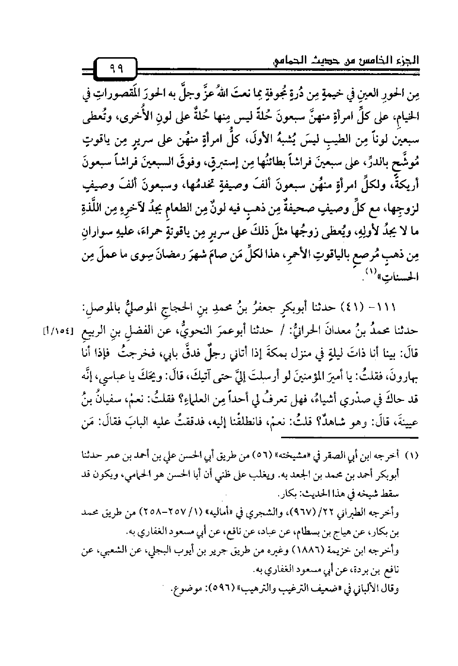 111 - (41) حدثنا أبوبكرٍ جعفرُ بنُ محمدِ بنِ الحجاجِ الموصليُّ بالموصلِ: حدثنا محمدُ بنُ معدانَ الحرانيُّ: / حدثنا أبوعمرَ النحويُّ، عن الفضلِ بنِ الربيعِ قالَ: بينا أنا ذاتَ ليلةٍ في منزل بمكةَ إذا أتاني رجلٌ فدقَّ بابي، فخرجتُ فإذا أنا بهارونَ، فقلتُ: يا أميرَ المؤمنينَ لو أرسلتَ إليَّ حتى آتيكَ، قالَ: ويحَكَ يا عباسي، إنَّه قد حاكَ في صدْري أشياءُ، فهل تعرفُ لي أحداً مِن العلماءِ؟ فقلتُ: نعمْ، سفيانُ بنُ عيينةَ، قالَ: وهو شاهدٌ؟ قلتُ: نعمْ، فانطلقْنا إليه، فدققتُ عليه البابَ فقالَ: مَن -[100]- هذا؟ قلتُ: أجبْ أميرَ المؤمنينَ، فخرجَ مُسرعاً فقالَ: يا أميرَ المؤمنينَ لو أرسلتَ إليَّ حتى آتيكَ، قالَ: خذ لِما جئناكَ له، فحدثَهُ ساعةً ثم قالَ له: يا ابنَ عُيينةَ أعليكَ دينٌ؟ فقالَ: نعمْ يا أميرَ المؤمنينَ، قالَ: يا عباسي اقضِ دينَهُ.