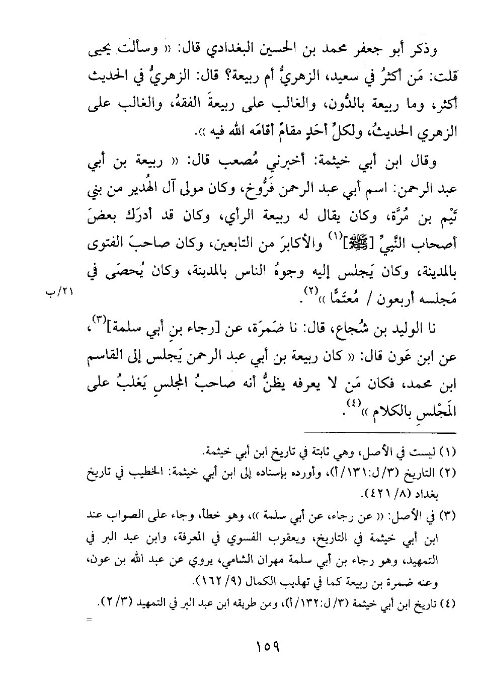 وقال ابن أبي خيثمة: أخبرني مصعب قال: ((ربيعة بن أبي عبد الرحمن: اسم أبي عبد الرحمن فروخ، وكان مولى آل الهدير من بني تيم بن مرة، وكان يقال له ربيعة الرأي، وكان قد أدرك بعض أصحاب النبي [صلى الله عليه وسلم] والأكابر من التابعين، وكان صاحب الفتوى بالمدينة، وكان يجلس إليه وجوه الناس بالمدينة، وكان يحصى في مجلسه أربعون معتماً)).