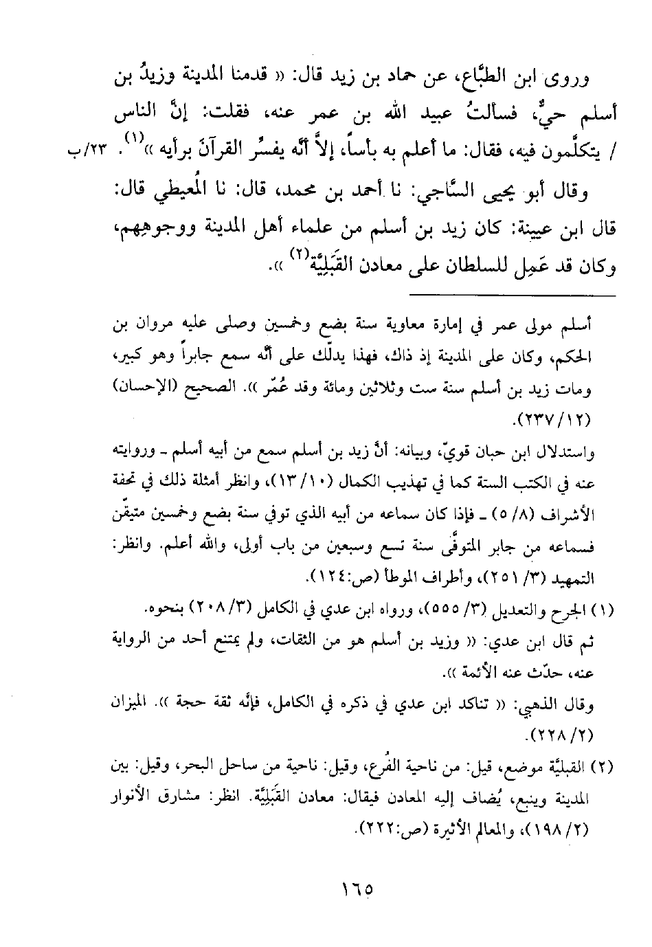 وقال أبو يحيى الساجي: نا أحمد بن محمد، قال: نا المعيطي قال: قال ابن عيينة: كان زيد بن أسلم من علماء أهل المدينة ووجوههم، وكان قد عمل للسلطان على معادن القبلية)).