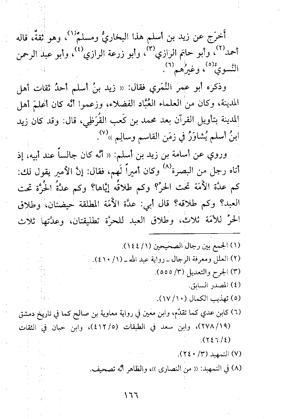 وروي عن أسامة بن زيد بن أسلم: ((أنه كان جالساً عند أبيه، إذ أتاه رجل من البصرة وكان أميراً لهم، فقال: إن الأمير يقول لك: كم عدة الأمة تحت الحر؟ وكم طلاقه إياها؟ وكم عدة الحرة تحت العبد؟ وكم طلاقه؟ قال أبي: عدة الأمة المطلقة حيضتان، وطلاق الحر للأمة ثلاث، وطلاق العبد للحرة تطليقتان، وعدتها ثلاث