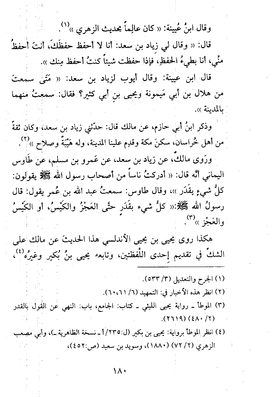 وروى مالكٌ، عن زياد بن سعد، عن عمرو بن مسلم، عن طاوس اليماني أنه قال: ((أدركت ناساً من أصحاب رسول الله صلى الله عليه وسلم يقولون: كل شيءٍ بقدر))، وقال طاوس: سمعت عبد الله بن عمر يقول: قال رسول الله صلى الله عليه وسلم: ((كل شيء بقدرٍ حتى العجز والكيس، أو الكيس والعجز)).