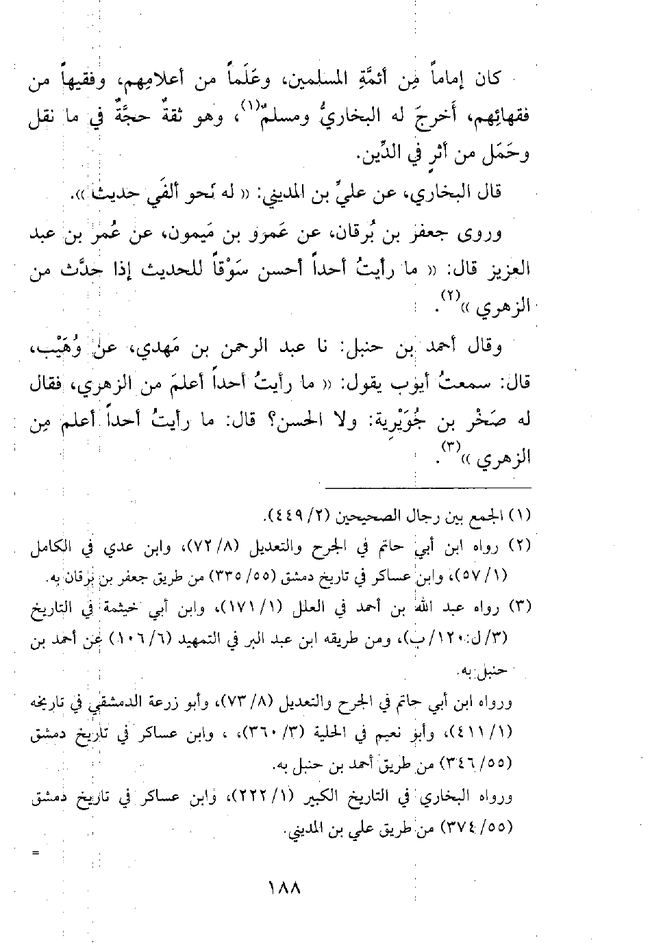 وقال أحمد بن حنبل: نا عبد الرحمن بن مهدي، عن وهيب، قال: سمعت أيوب يقول: ((ما رأيت أحداً أعلم من الزهري، فقال له صخر بن جويرية: ولا الحسن؟ قال: ما رأيت أحداً أعلم من الزهري)).