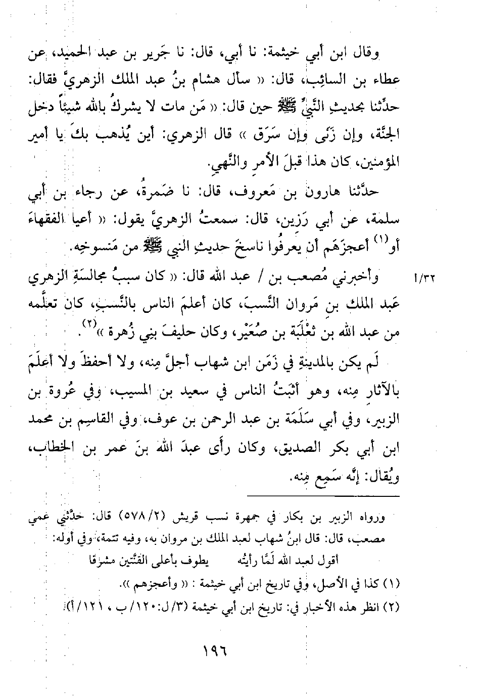 وأخبرني مصعب بن عبد الله قال: ((كان سبب مجالسة الزهري عبد الملك بن مروان النسب، كان أعلم الناس بالنسب، كان تعلمه من عبد الله بن ثعلبة بن صعير، وكان حليف بني زهرة)).
