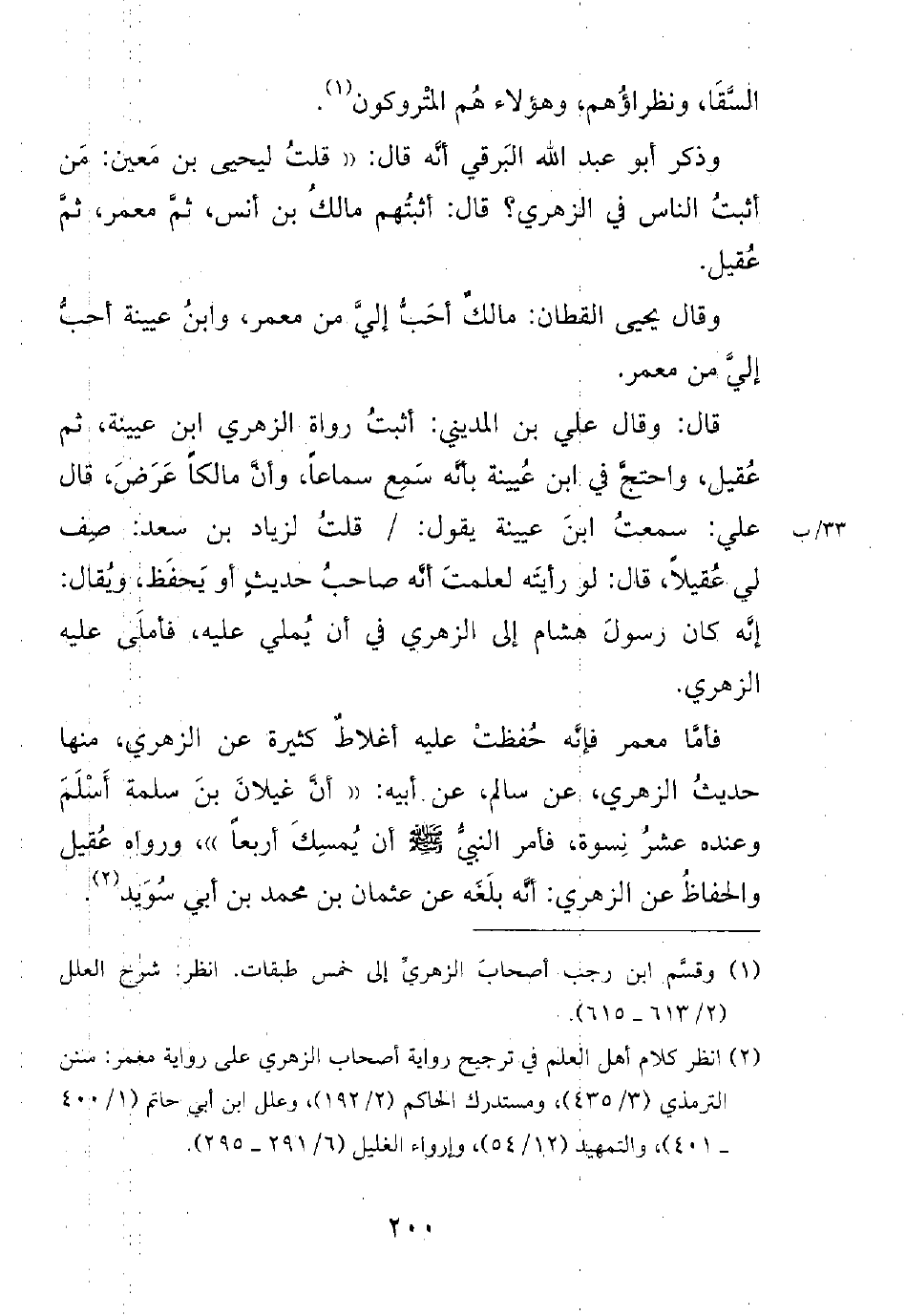 قال: وقال علي بن المديني: أثبت رواة الزهري ابن عيينة، ثم عقيل، واحتج في ابن عيينة بأنه سمع سماعاً، وأن مالكاً عرض، قال علي: سمعت ابن عيينة يقول: قلت لزياد بن سعد: صف لي عقيلاً، قال: لو رأيته لعلمت أنه صاحب حديثٍ أو يحفظ، ويقال: إنه كان رسول هشام إلى الزهري في أن يملي عليه، فأملى عليه الزهري.