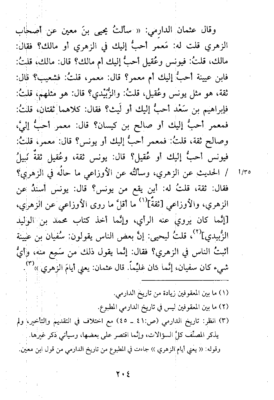 وقال عثمان الدارمي: ((سألت يحيى بن معين عن أصحاب الزهري قلت له: معمر أحب إليك في الزهري أو مالك؟ فقال: مالك، قلت: فيونس وعقيل أحب إليك أم مالك؟ قال: مالك، قلت: فابن عيينة أحب إليك أم معمر؟ قال: معمر، قلت: فشعيب؟ قال: ثقة، هو مثل يونس وعقيل، قلت: والزبيدي؟ قال: هو مثلهم، قلت: فإبراهيم بن سعد أحب إليك أو ليث؟ فقال: كلاهما ثقتان، قلت: فمعمر أحب إليك أو صالح بن كيسان؟ قال: معمر أحب إلي، وصالح ثقة، قلت: فمعمر أحب إليك أو يونس؟ قال: معمر، قلت: فيونس أحب إليك أو عقيل؟ قال: يونس ثقة، وعقيل ثقةٌ نبيل الحديث عن الزهري، وسألته عن الأوزاعي ما حاله في الزهري؟ فقال: ثقة، قلت له: أين يقع من يونس؟ قال: يونس أسند عن الزهري، والأوزاعي [ثقةٌ] ما أقل ما روى الأوزاعي عن الزهري، [إنما كان يروي عنه الرأي، وإنما أخذ كتاب محمد بن الوليد الزبيدي]، قلت ليحيى: إن بعض الناس يقولون: سفيان بن عيينة أثبت الناس في الزهري؟ فقال: إنما يقول ذلك من سمع منه، وأي شيء كان سفيان، إنما كان غليماً. قال عثمان: يعني أيام الزهري)).