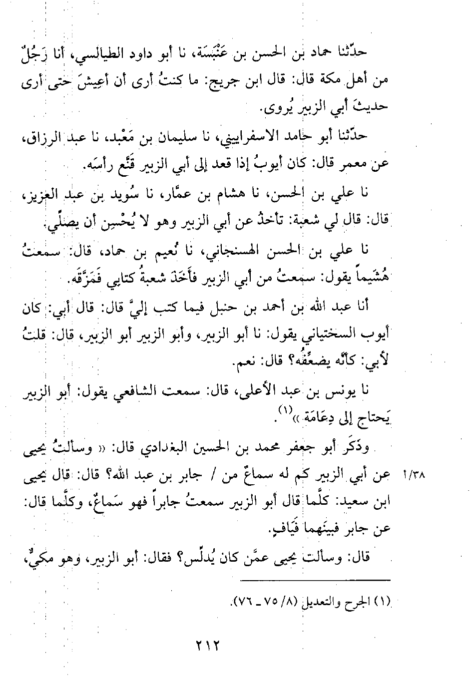 وذكر أبو جعفر محمد بن الحسين البغدادي قال: ((وسألت يحيى عن أبي الزبير كم له سماعٌ من جابر بن عبد الله؟ قال: قال يحيى ابن سعيد: كلما قال أبو الزبير سمعت جابراً فهو سماعٌ، وكلما قال: عن جابر فبينهما فيافٍ.