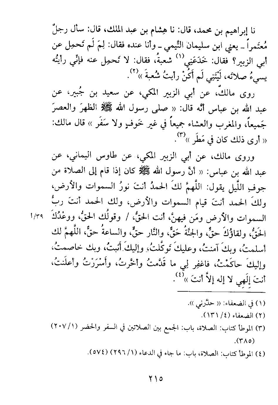 وروى مالك، عن أبي الزبير المكي، عن طاوس اليماني، عن عبد الله بن عباس: ((أن رسول الله صلى الله عليه وسلم كان إذا قام إلى الصلاة من جوف الليل يقول: اللهم لك الحمد أنت نور السموات والأرض، ولك الحمد أنت قيام السموات والأرض، ولك الحمد أنت رب السموات والأرض ومن فيهن، أنت الحق، وقولك الحق، ووعدك الحق، ولقاؤك حقٌ، والجنة حقٌ، والنار حقٌ، والساعة حقٌ، اللهم لك أسلمت، وبك آمنت، وعليك توكلت، وإليك أنبت، وبك خاصمت، وإليك حاكمت، فاغفر لي ما قدمت وأخرت، وأسررت وأعلنت، أنت إلهي لا إله إلا أنت)).