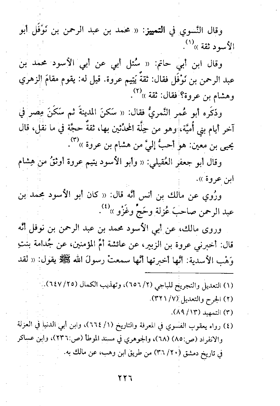 وقال ابن أبي حاتم: ((سئل أبي عن أبي الأسود محمد بن عبد الرحمن بن نوفل فقال: ثقةٌ يتيم عروة. قيل له: يقوم مقام الزهري وهشام بن عروة؟ فقال: ثقة)).