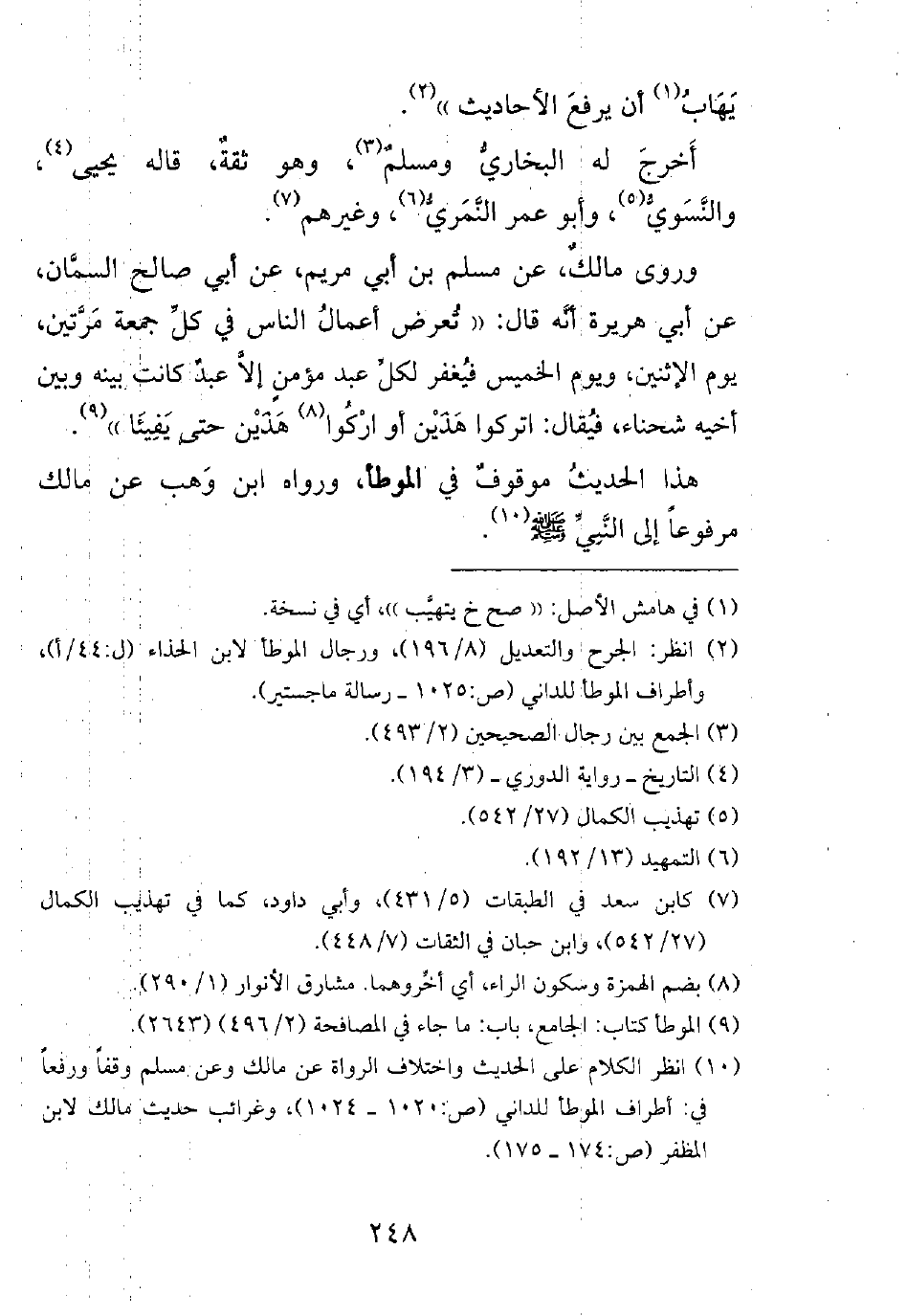 وروى مالكٌ، عن مسلم بن أبي مريم، عن أبي صالح السمان، عن أبي هريرة أنه قال: ((تعرض أعمال الناس في كل جمعة مرتين، يوم الإثنين، ويوم الخميس فيغفر لكل عبد مؤمنٍ إلا عبدٌ كانت بينه وبين أخيه شحناء، فيقال: اتركوا هذين أو اركوا هذين حتى يفيئا)).