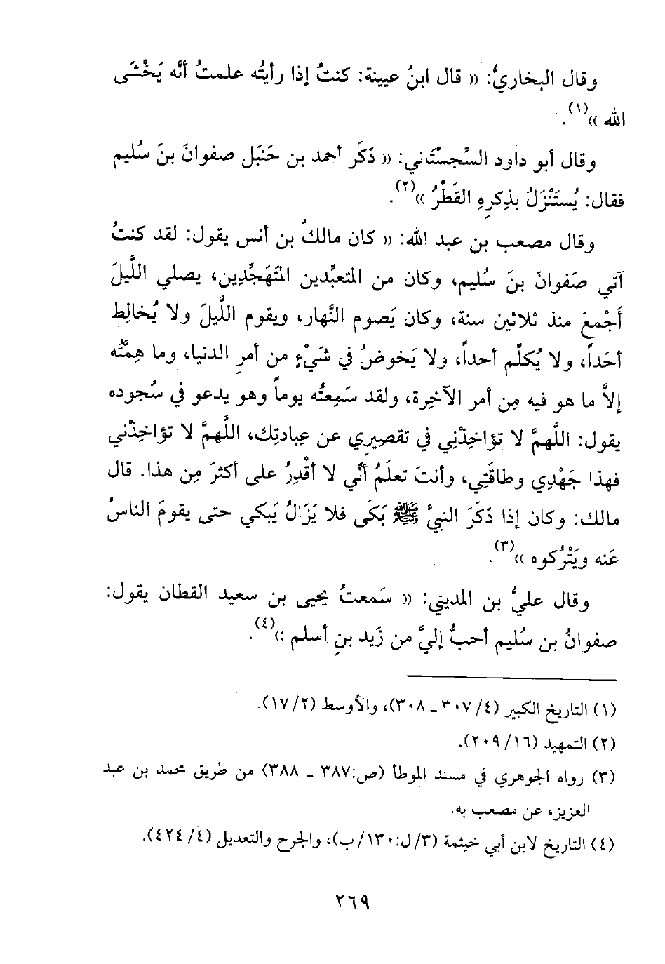 وقال مصعب بن عبد الله: ((كان مالك بن أنس يقول: لقد كنت آتي صفوان بن سليم، وكان من المتعبدين المتهجدين، يصلي الليل أجمع منذ ثلاثين سنة، وكان يصوم النهار، ويقوم الليل ولا يخالط أحداً، ولا يكلم أحداً، ولا يخوض في شيءٍ من أمر الدنيا، وما همته إلا ما هو فيه من أمر الآخرة، ولقد سمعته يوماً وهو يدعو في سجوده يقول: اللهم لا تؤاخذني في تقصيري عن عبادتك، اللهم لا تؤاخذني فهذا جهدي وطاقتي، وأنت تعلم أني لا أقدر على أكثر من هذا. قال مالك: وكان إذا ذكر النبي صلى الله عليه وسلم بكى فلا يزال يبكي حتى يقوم الناس عنه ويتركوه)).
