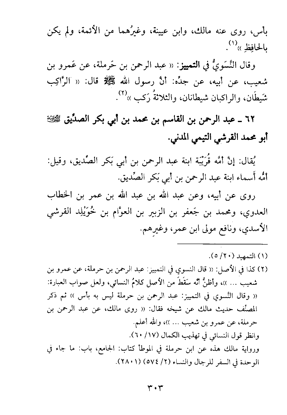 وقال النسوي في التمييز: ((عبد الرحمن بن حرملة، عن عمرو بن شعيب، عن أبيه، عن جده: أن رسول الله صلى الله عليه وسلم قال: ((الراكب شيطان، والراكبان شيطانان، والثلاثة ركب)).