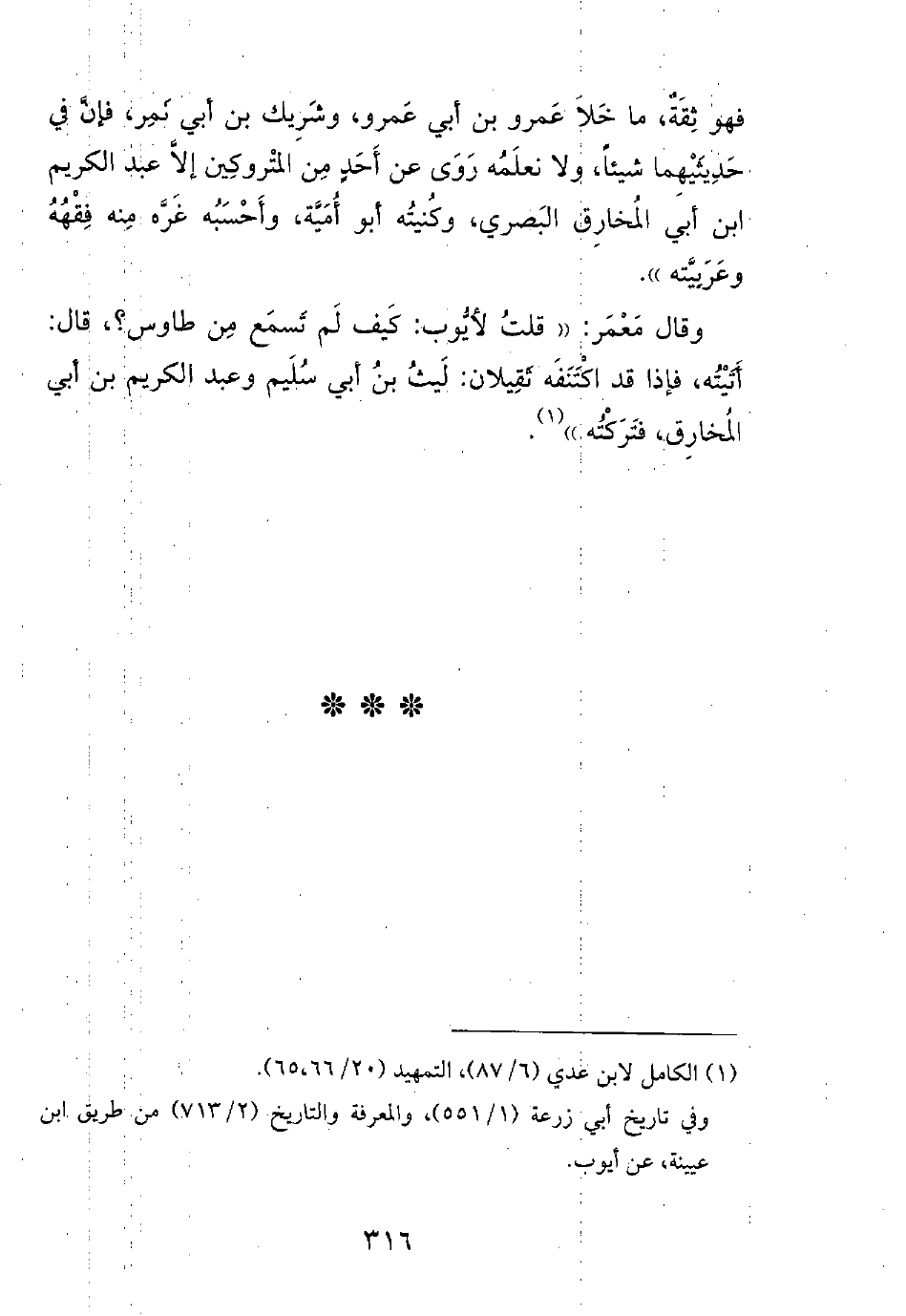وقال معمر: ((قلت لأيوب: كيف لم تسمع من طاوس؟، قال: أتيته، فإذا قد اكتنفه ثقيلان: ليث بن أبي سليم وعبد الكريم بن أبي المخارق، فتركته)).
