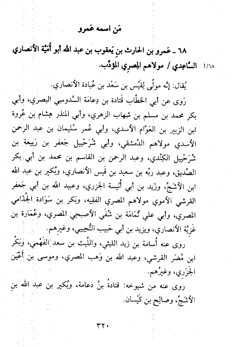 68- عمرو بن الحارث بن يعقوب بن عبد الله أبو أمية الأنصاري الساعدي مولاهم المصري المؤدب.