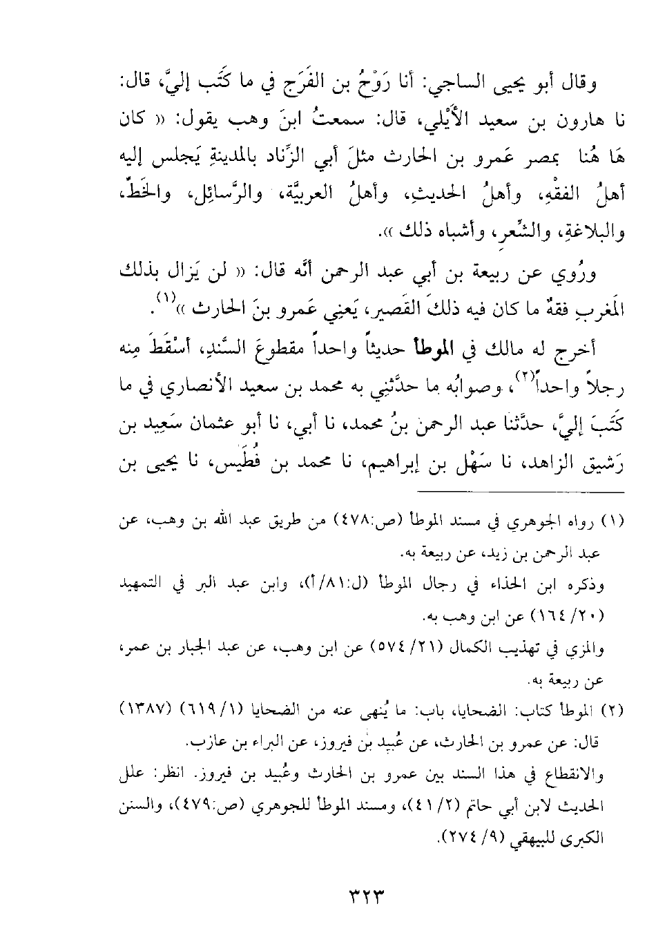 أخرج له مالك في الموطأ حديثاً واحداً مقطوع السند، أسقط منه رجلاً واحداً، وصوابه ما حدثني به محمد بن سعيد الأنصاري في ما كتب إلي، حدثنا عبد الرحمن بن محمد، نا أبي، نا أبو عثمان سعيد بن رشيق الزاهد، نا سهل بن إبراهيم، نا محمد بن فطيس، نا يحيى بن