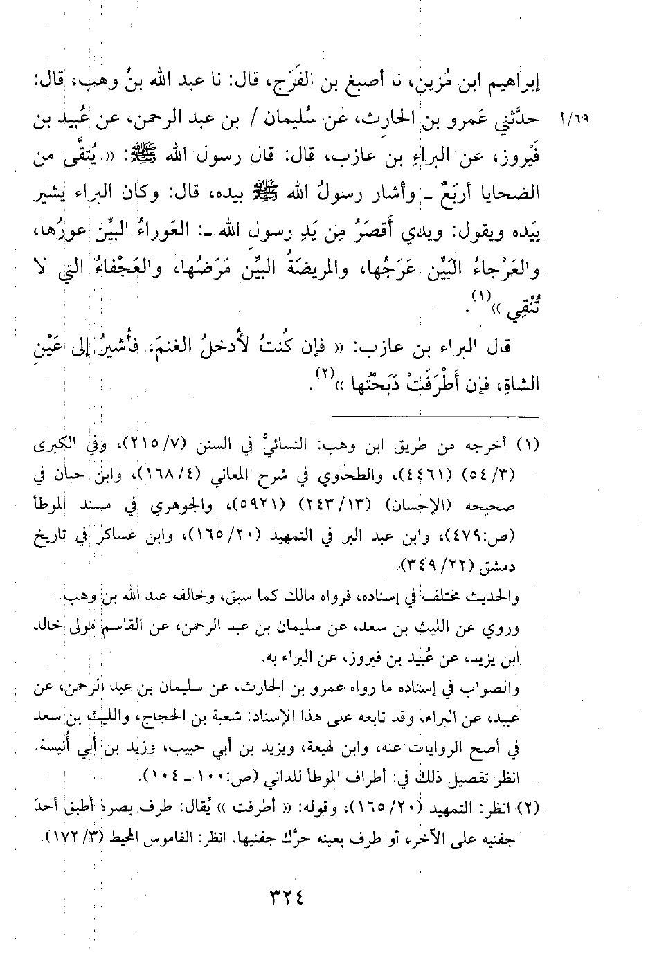 إبراهيم ابن مزين، نا أصبغ بن الفرج، قال: نا عبد الله بن وهب، قال: حدثني عمرو بن الحارث، عن سليمان بن عبد الرحمن، عن عبيد بن فيروز، عن البراء بن عازب، قال: قال رسول الله صلى الله عليه وسلم: ((يتقى من الضحايا أربعٌ -وأشار رسول الله صلى الله عليه وسلم بيده، قال: وكان البراء يشير بيده ويقول: ويدي أقصر من يد رسول الله-: العوراء البين عورها، والعرجاء البين عرجها، والمريضة البين مرضها، والعجفاء التي لا تنقي)).
