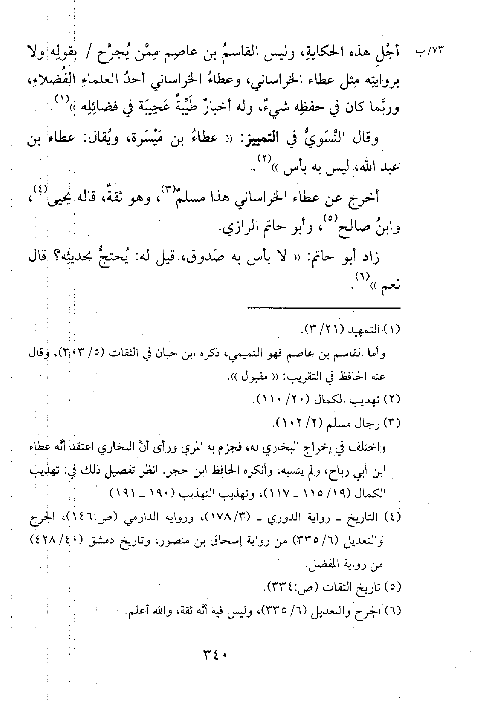 أجل هذه الحكاية، وليس القاسم بن عاصم ممن يجرح بقوله ولا بروايته مثل عطاء الخراساني، وعطاء الخراساني أحد العلماء الفضلاء، وربما كان في حفظه شيءٌ، وله أخبارٌ طيبةٌ عجيبة في فضائله)).