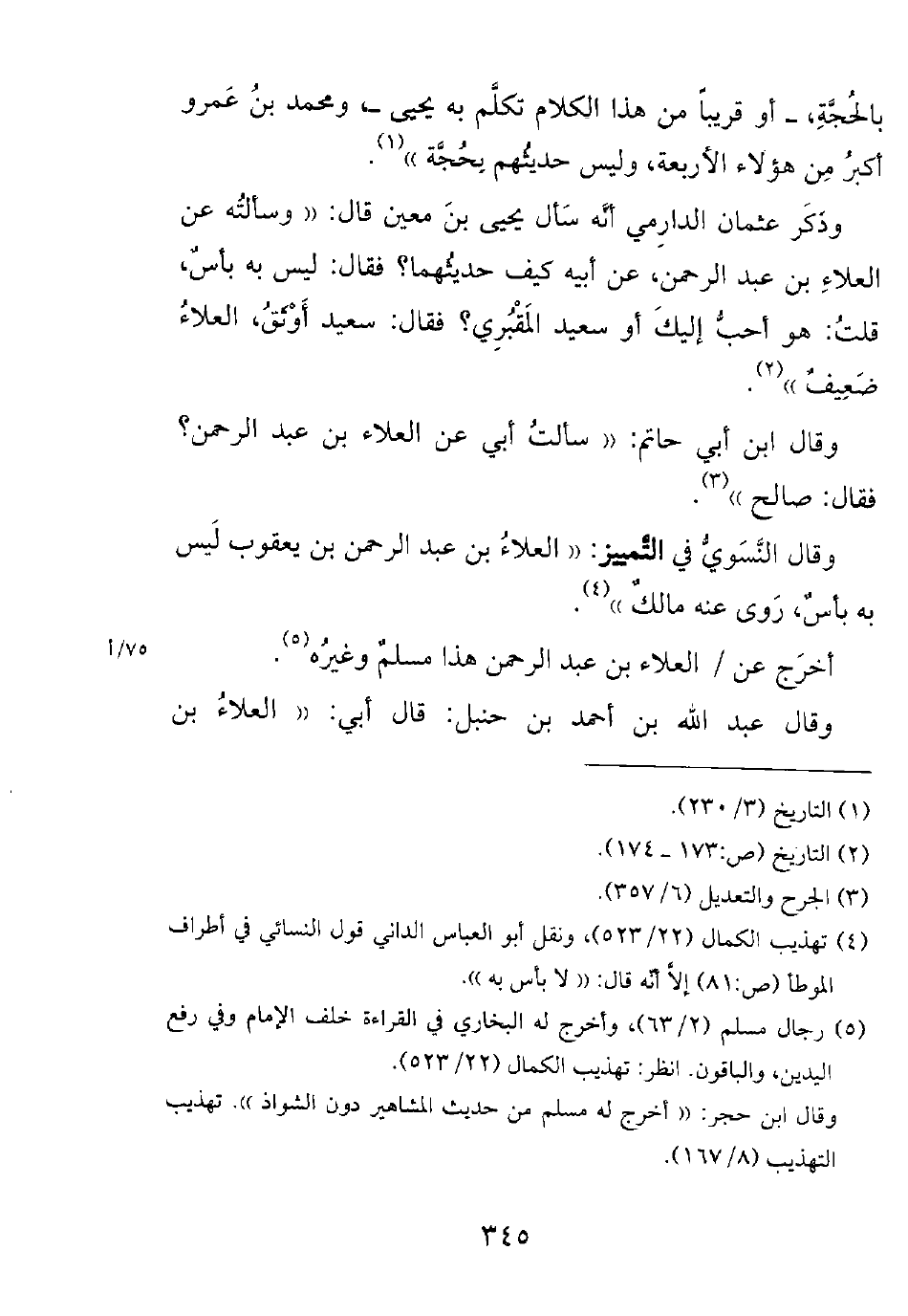 وذكر عثمان الدارمي أنه سأل يحيى بن معين قال: ((وسألته عن العلاء بن عبد الرحمن، عن أبيه كيف حديثهما؟ فقال: ليس به بأسٌ، قلت: هو أحب إليك أو سعيد المقبري؟ فقال: سعيد أوثق، العلاء ضعيفٌ)).