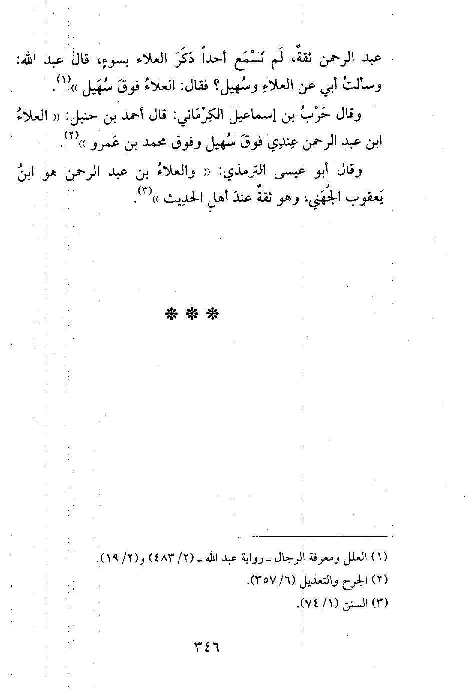 عبد الرحمن ثقةٌ، لم نسمع أحداً ذكر العلاء بسوءٍ، قال عبد الله: وسألت أبي عن العلاء وسهيل؟ فقال: العلاء فوق سهيل)).