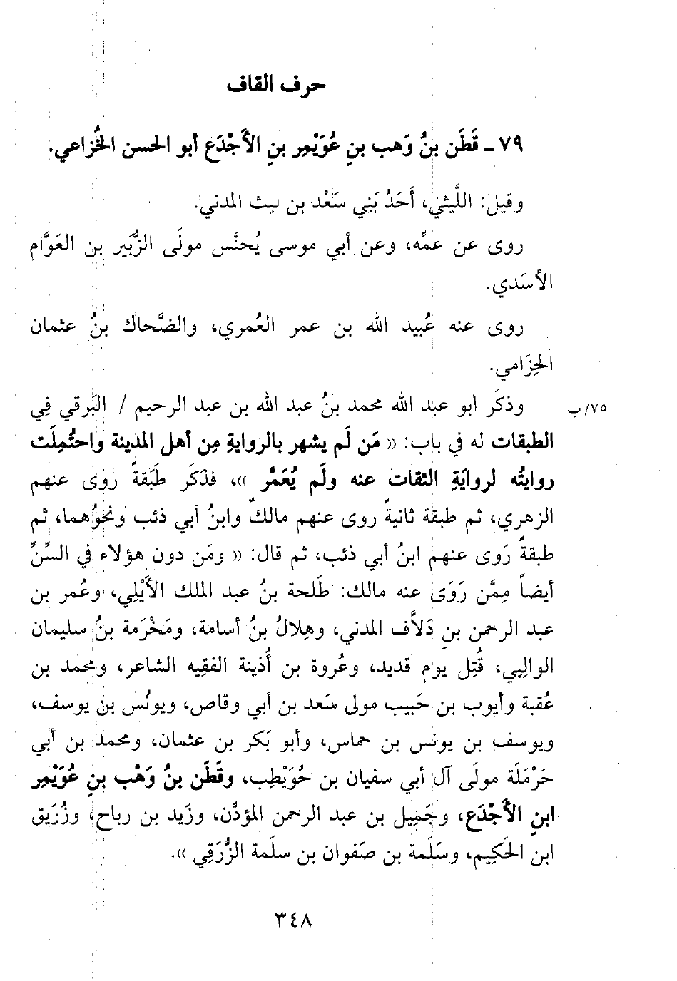 وذكر أبو عبد الله محمد بن عبد الله بن عبد الرحيم البرقي في الطبقات له في باب: ((من لم يشهر بالرواية من أهل المدينة واحتملت روايته لرواية الثقات عنه ولم يعمر))، فذكر طبقةً روى عنهم الزهري، ثم طبقة ثانيةً روى عنهم مالكٌ وابن أبي ذئب ونحوهما، ثم طبقةً روى عنهم ابن أبي ذئب، ثم قال: ((ومن دون هؤلاء في السن أيضاً ممن روى عنه مالك: طلحة بن عبد الملك الأيلي، وعمر بن عبد الرحمن بن دلاف المدني، وهلال بن أسامة، ومخرمة بن سليمان الوالبي، قتل يوم قديد، وعروة بن أذينة الفقيه الشاعر، ومحمد بن عقبة وأيوب بن حبيب مولى سعد بن أبي وقاص، ويونس بن يوسف، ويوسف بن يونس بن حماس، وأبو بكر بن عثمان، ومحمد بن أبي حرملة مولى آل أبي سفيان بن حويطب، وقطن بن وهب بن عويمر ابن الأجدع، وجميل بن عبد الرحمن المؤذن، وزيد بن رباح، وزريق ابن الحكيم، وسلمة بن صفوان بن سلمة الزرقي)).